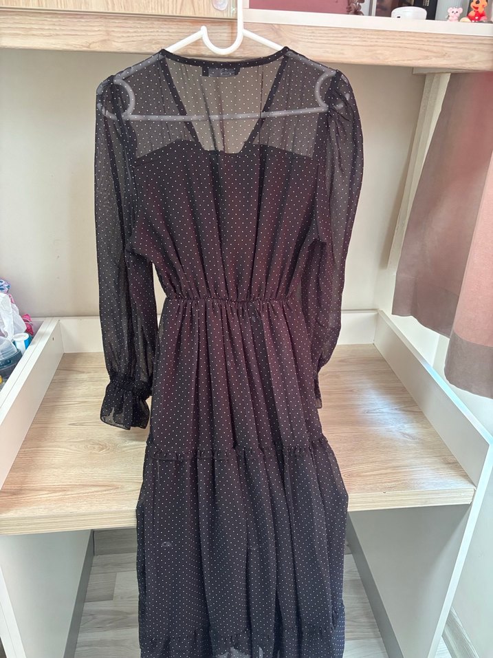 Uzun siyah elbise, V yaka ve bol kesim ile fırfır detaylarına sahiptir. Yumuşak sentetik kumaştan üretilmiş, günlük kullanım için uygun