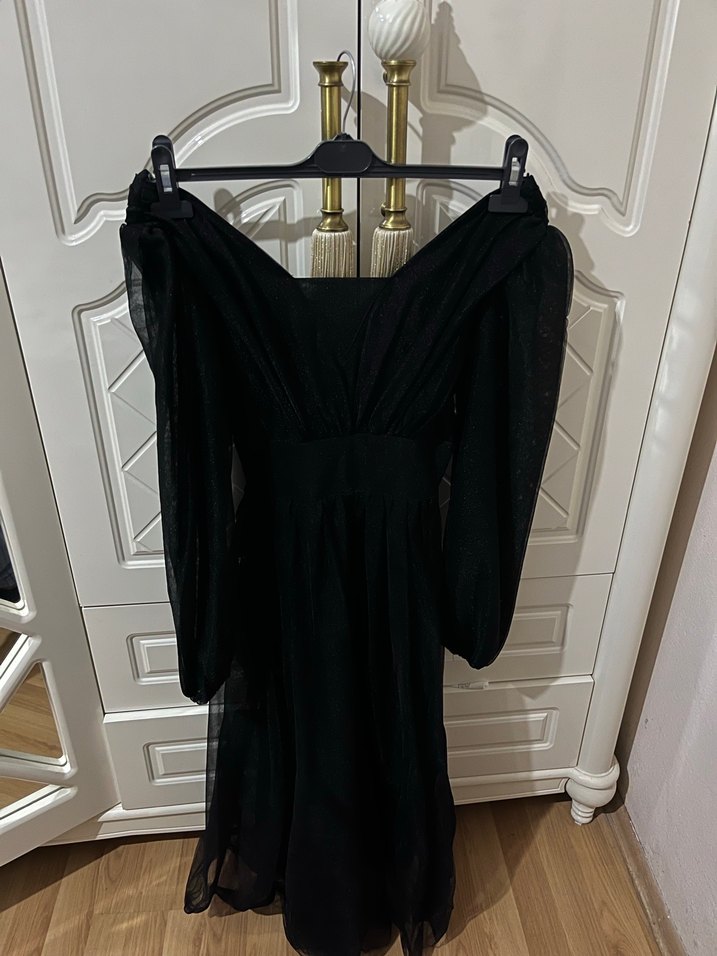 Uzun siyah elbise, V yaka ve askılı kollara sahip. Gevşek kesim ve drapeli tasarımıyla gotik tarzda, romantik akşamlar için uygun.