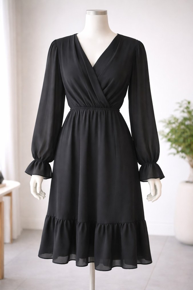 Bu uzun siyah elbise, drapeli V yakası ve uzun kollu, bol kesimi ile şık ve klasik bir görünüm sunar. Ofis için uygundur.