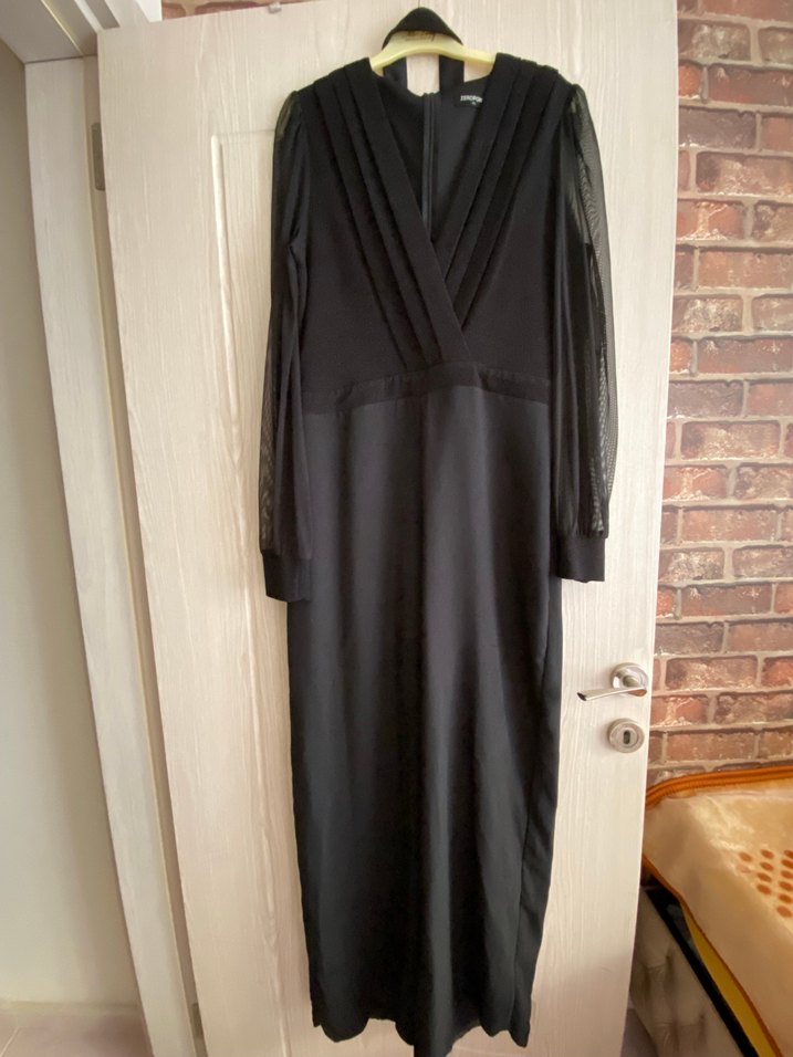Uzun siyah V yaka tulum , drapeli V yaka ve uzun kolludur kolları tüldür iç gösterir Yumuşak sentetik kumaştan, düzenli kesim ve mütevazı gotik tarzda, ofis için uygundur özel günler için uygundur