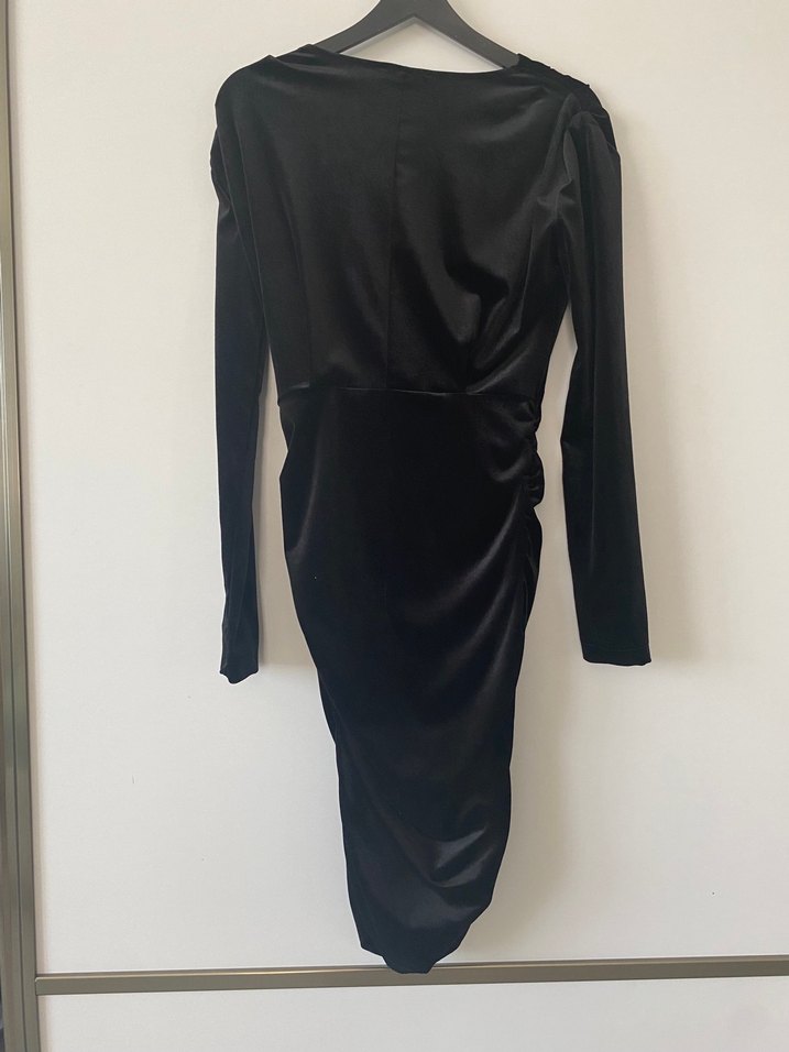 V yakalı, drapeli, uzun siyah elbise, gotik tarzda, uzun kollu ve vücuda oturan kesime sahip, ofis ortamına uygun.