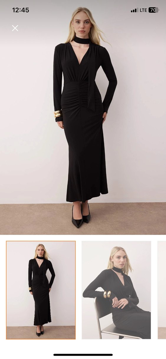 Uzun siyah elbise, V yakalı ve uzun kollu, ince kesimlidir. İpekçe dokusu ve drapeli detayıyla klasik gotik şıklık sunar, ofis için uygundur. Hiç giymedim sayfamda var. Fiytta anlaşırız