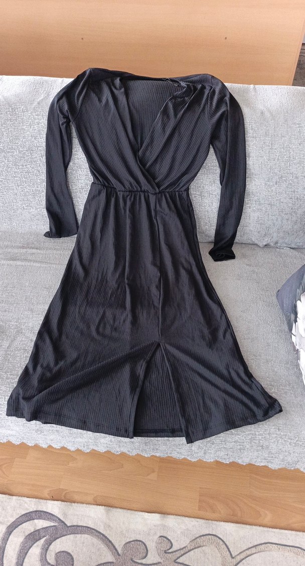 Uzun siyah elbise, v yakalı ve drapeli tasarıma sahiptir. Uzun kollu ve yumuşak sentetik kumaştan yapılmıştır. Rahat ve şık bir görünüme uygundur.