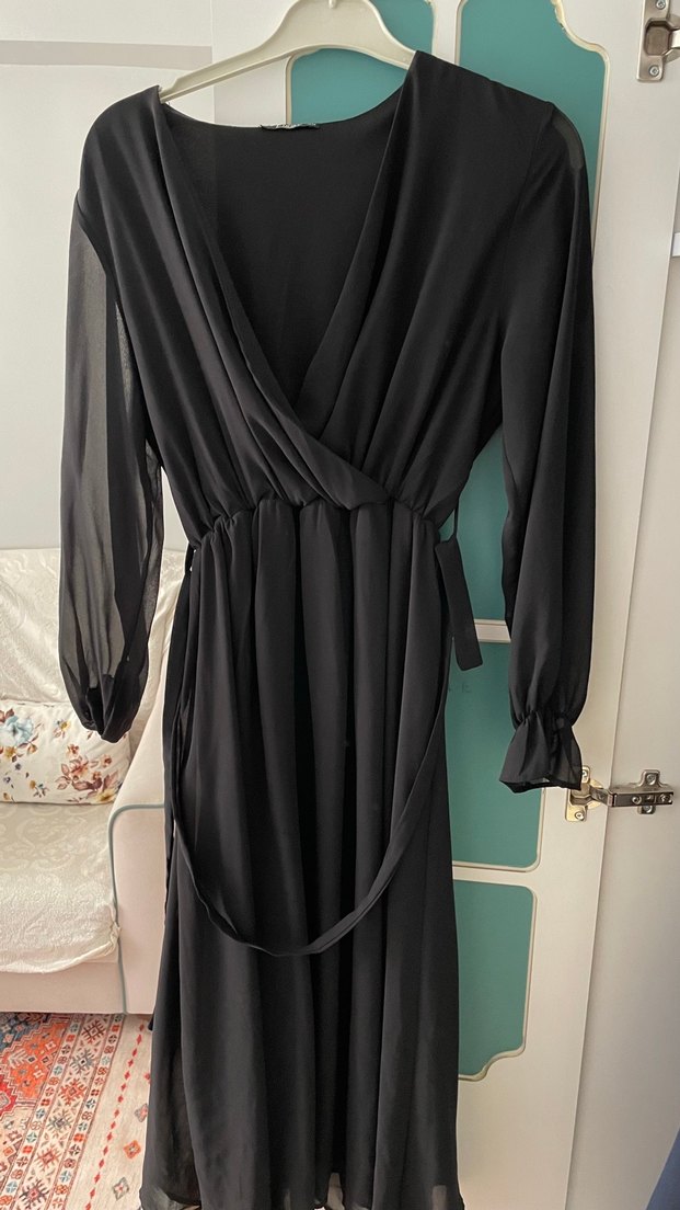 Uzun siyah elbise, V yakalı ve drapeli tasarıma sahiptir. İpek gibi kumaştan, bol kesim ve klasik şıklık sunar, ofis için uygundur.