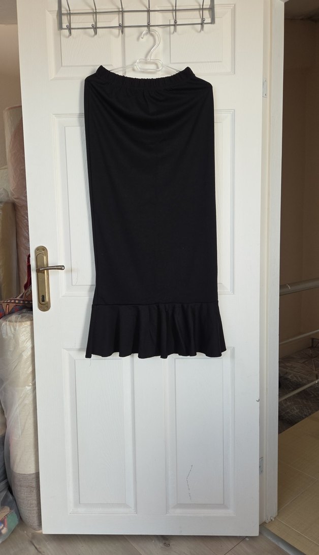 Fitted kesim uzun siyah etek, etek ucunda volan detayıyla. Düz, sentetik kumaştan, minimalist gotik tarz için uygundur.