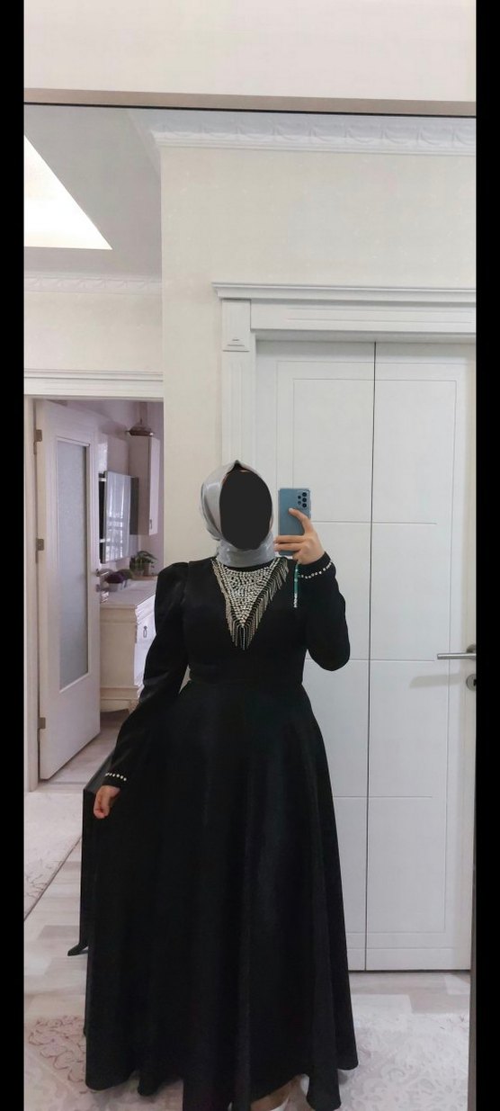 Siyah uzun, yüksek yakalı ve uzun kollu tesettür abiye elbise. 2 kere giyildi. Rengi fotoğraflarda tam belli olmamış olabilir. Tereddüt ettiğiniz bir detay olursa video atabilirim, ekstra fotoğraf çekebilirim. Sökük, daraltma herhangi bir işlemi ya da kusuru yok. 40-42 beden giyebilir elbiseyi. Kuşağı ile beraber gönderilecektir. 1.57 boy 65 kiloda giyildi.
