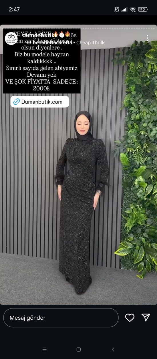 Uzun siyah yılan desenli abiye elbise, yüksek yaka ve uzun kolludur. Drapeli tasarımı ve regular kesimiyle hem mütevazı hem de göz alıcı goth tarzı sunar.
