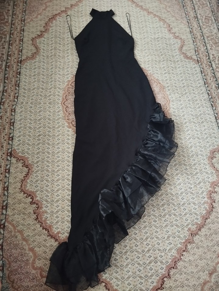 Uzun Siyah Yırtmaçlı Fırfırlı Elbise