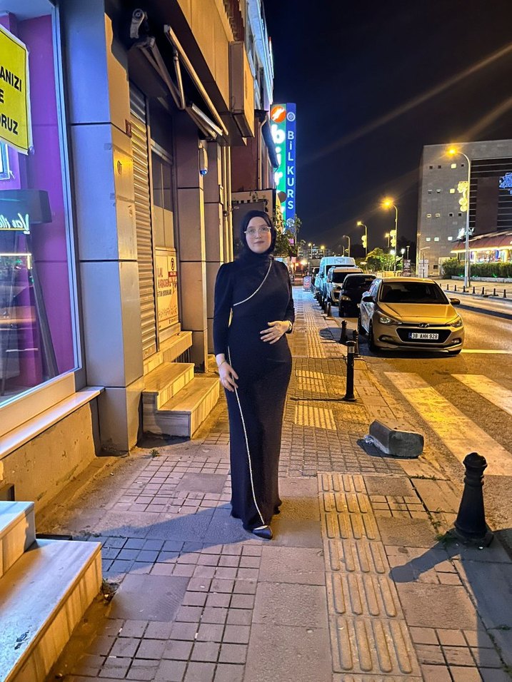 Siyah, uzun, yüksek yakalı ve uzun kollu, yırtmaç detaylı, ipeksi kumaştan yapılmış, modest taş detaylı vücuda oturan kadın elbisesi.
