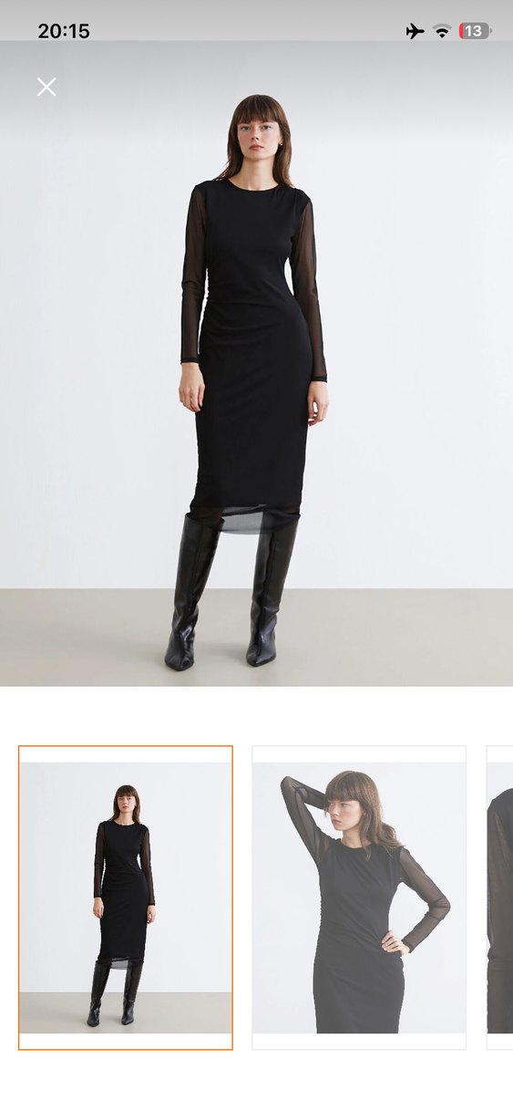Uzun siyah elbise, yüksek yakalı ve uzun tül kollu olup, ofis için şık ve dar kesimdir. Minimalist, gotik tarzda, desensiz ve sentetik kumaştan yapılmıştır.