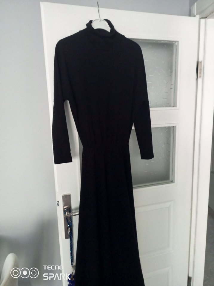 Bu uzun siyah elbise, yüksek yakalı ve uzun kolludur. Sentetik kumaştan yapılmış, oturan kesimiyle minimalist drapeli tasarıma sahiptir, ofis için uygundur.