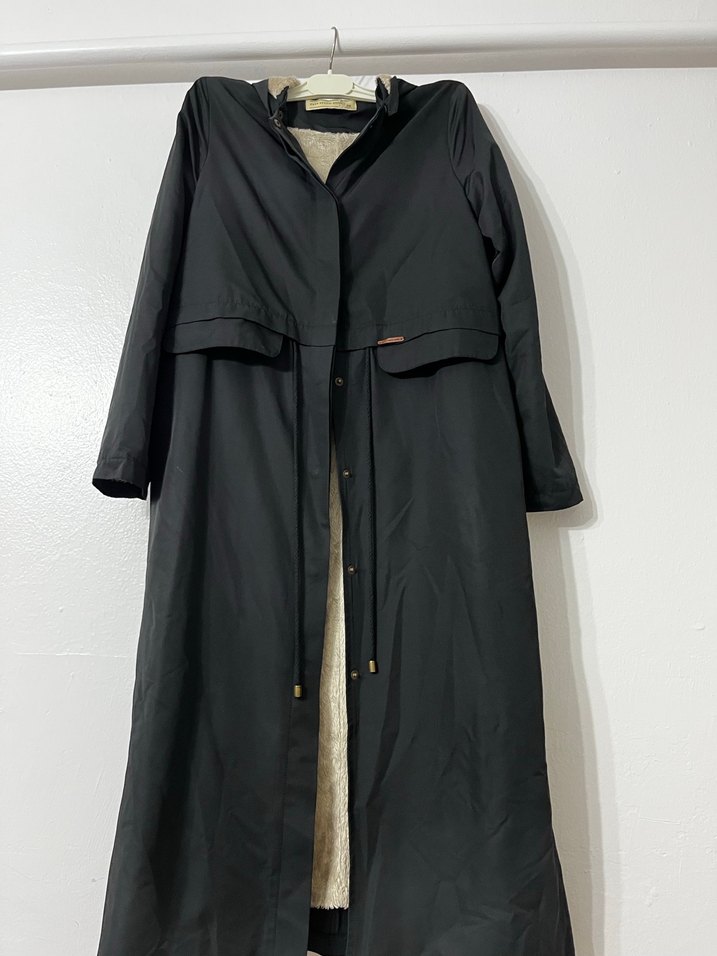 Uzun siyah yünlü kadın mont Trençkot