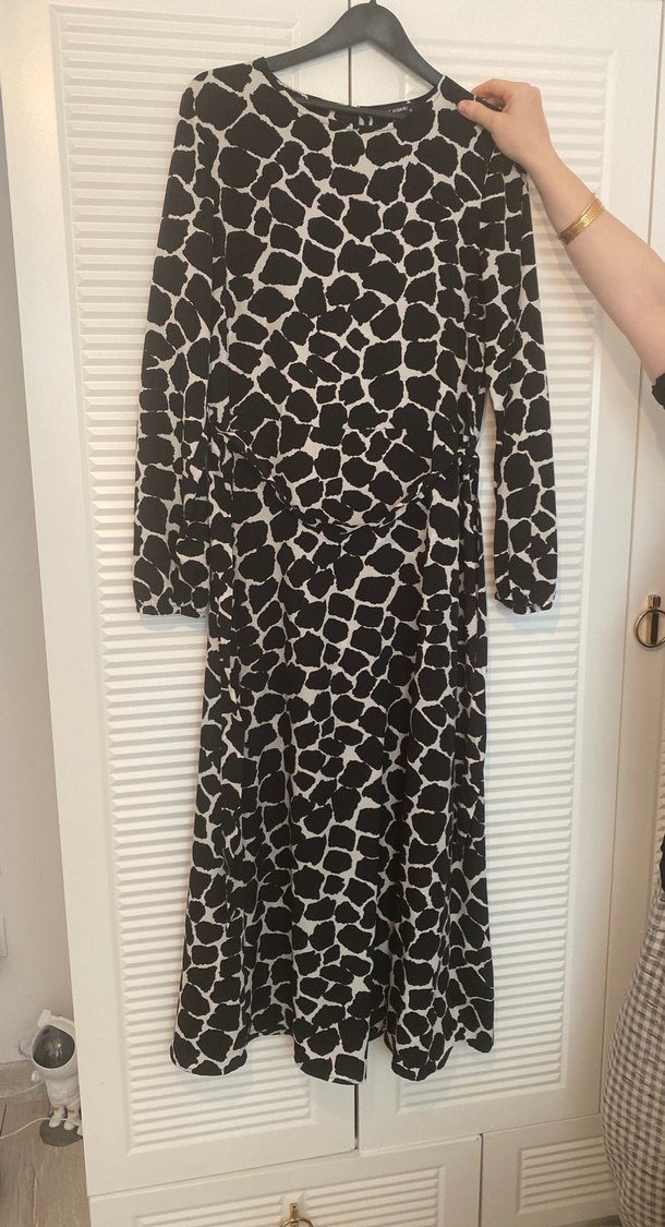 Uzun siyah zebra desenli elbise, yüksek yakalı ve askılı kolludur. Rahat kesimli, dökümlü ve yumuşak sentetik kumaştan yapılmıştır.