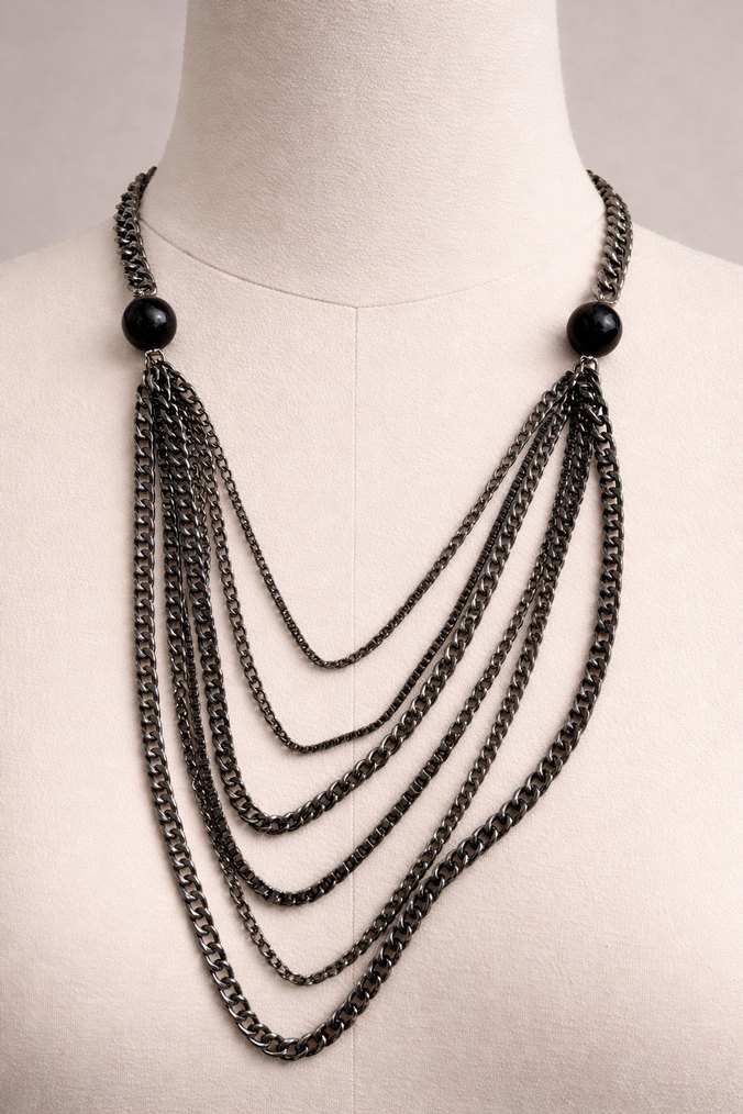 Uzun siyah zincirden oluşan, gotik tarzda çok katmanlı kadın kolye. Gri siyah tonlarıyla günlük kullanıma uygundur.