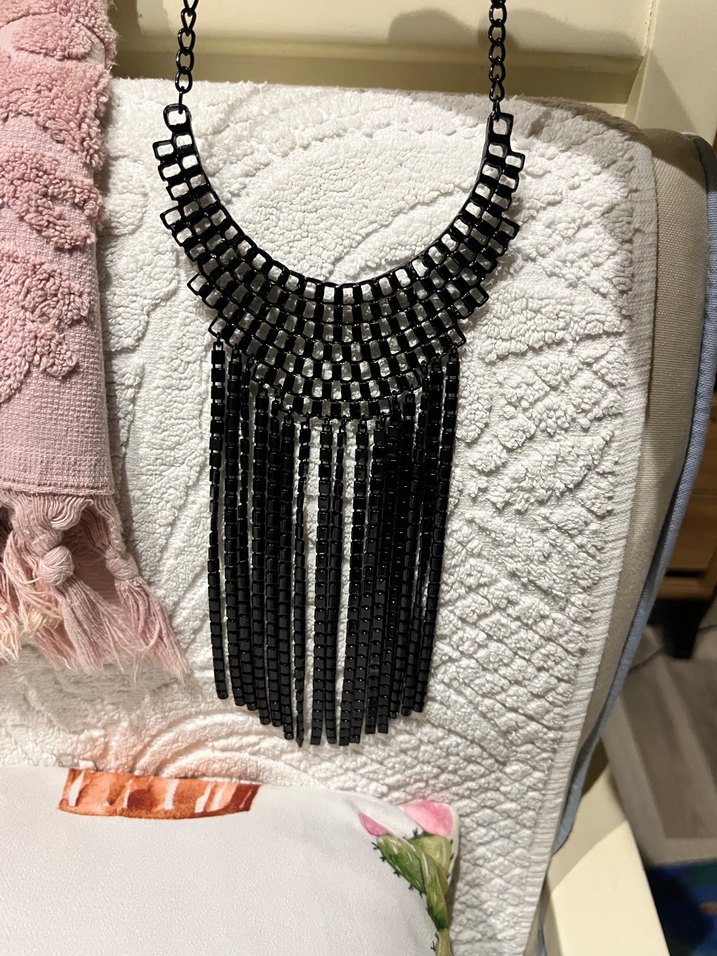 Uzun siyah kolye, zincir detayları ve nakışlı deseniyle gotik ve avangart tarzı yansıtıyor. Günlük kullanıma uygundur. Ürün aldığımdan beri çekmecede duruyor kullanılmadı. İstenilen uzunluğu ayarlayıp kullanabilirsiniz. Şık gece konseptine uygundur.