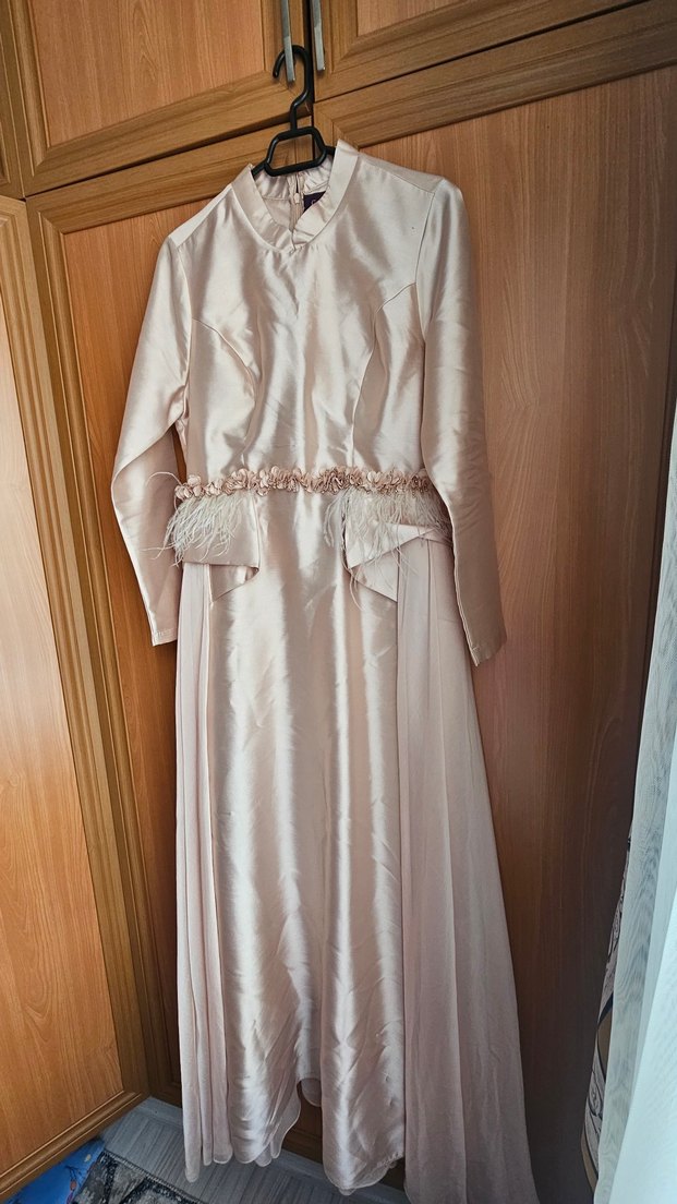 Uzun, somon renkte olan bu klasik düğün elbisesi, kesimli yaka ve uzun kolludur. Kuşak kısmında tüy detaylı drapeli tasarıma sahiptir. Vintage şıklık sunar. ️