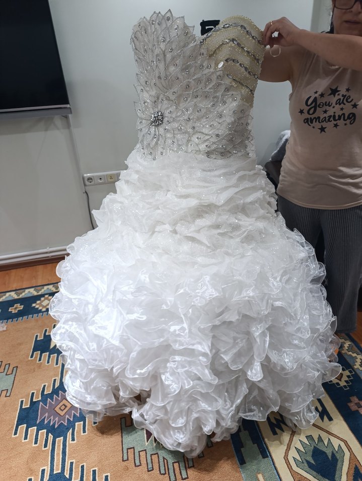 Uzun beyaz gelinlik, straplez yakalı ve işlemeli dar kesim üst kısmıyla dikkat çekiyor. Etek kısmı kat kat dalgalı tasarıma sahip, kolsuz ve şık bir model. KABARIK TAŞLI UYGUN FİYATLI GELİNLİK Kalıp türü: NORMAL Herhangi bir defolu durum yok, bir kere kullanılmıştır. Renk: Çok iyi durumda, kullanım yapılmıştır. Ürün etiketi üzerinde mevcut bulunmamaktadır. BEDEN: 38 beden Maddi durumu olmayana yardımcı olunur. Tartarı mevcut. Duvağı ve tacı mevcut. #abiye #elbise #moda #butik #giyim #düğün #yenisezon #nişan #fashion #mezuniyet #trend #kombin #bayangiyim #kına #elbisemodelleri #tarz #abiyemodelleri #abiyeelbise #trend #sosyalmedya #siparis #populer #gerikazanım