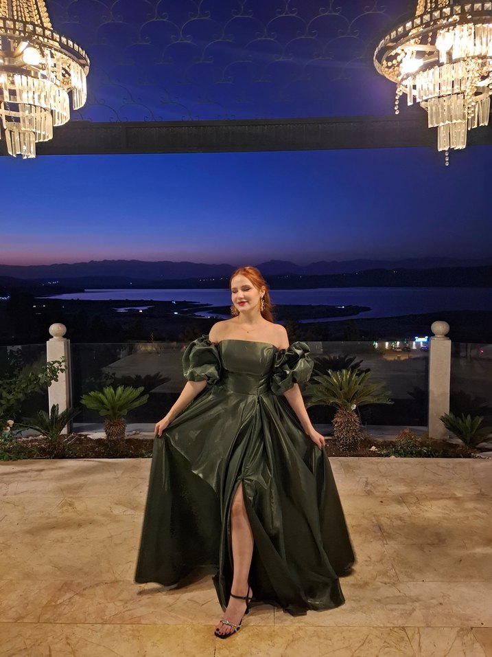 Bu dar kesim, uzun gotik elbise straplez yaka ve drapeli, askılı kollarla koyu haki renktedir. Desensiz ve şık parti kıyafeti olarak uygundur. S/m bedene uygundur kilom 60 boyum bir 60 sekizdir arka tarafı full bağcıklı o yüzden herhangi bir şekilde üst tarafının olmaması gibi bir durumu yok istenilen kiloya göre ayarlanabilir kolları çıkabiliyor