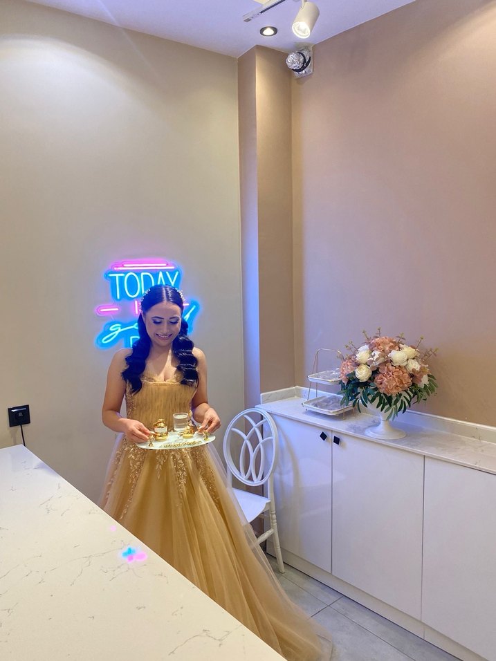 Uzun, straplez ve fit kesim altın renkli, transparan kumaş üzerine baskılı detaylara sahip nişan elbisesi, göz alıcı ve pop kültür tarzını yansıtıyor. ✨