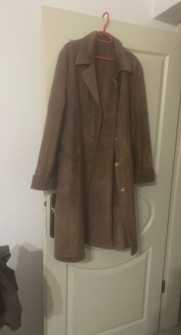 Uzun kahverengi süet kaban, kesik yaka ve düğmeli kapama özelliğine sahiptir. Normal kesim ve uzun kolludur, günlük kullanıma uygundur. Desensiz ve klasik Paris tarzındadır.