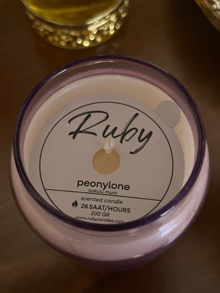 Ruby kokulu mum, 200 gram ağırlığında ve 26 saat yanma süresine sahiptir. Uzun süre kalıcı hoş bir koku sunar. ️