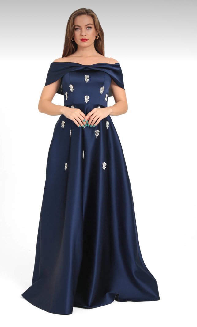 Uzun Taşlı Lacivert Abiye Elbise