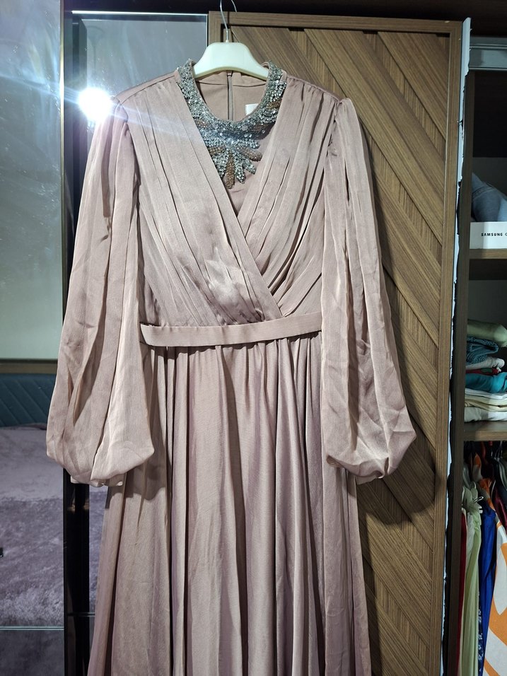 uzun kabarık abiye önünde tek kaçması var kolundada sökük var