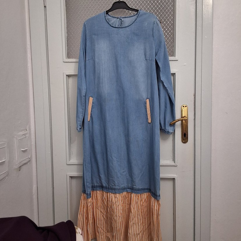 Uzun kol ve yuvarlak yakalı, bol kesim denim elbise. Etek kısmında pileli ve renk kontrastlı tie-dye deseni bulunur. Günlük kullanıma uygun bohem tarzda.