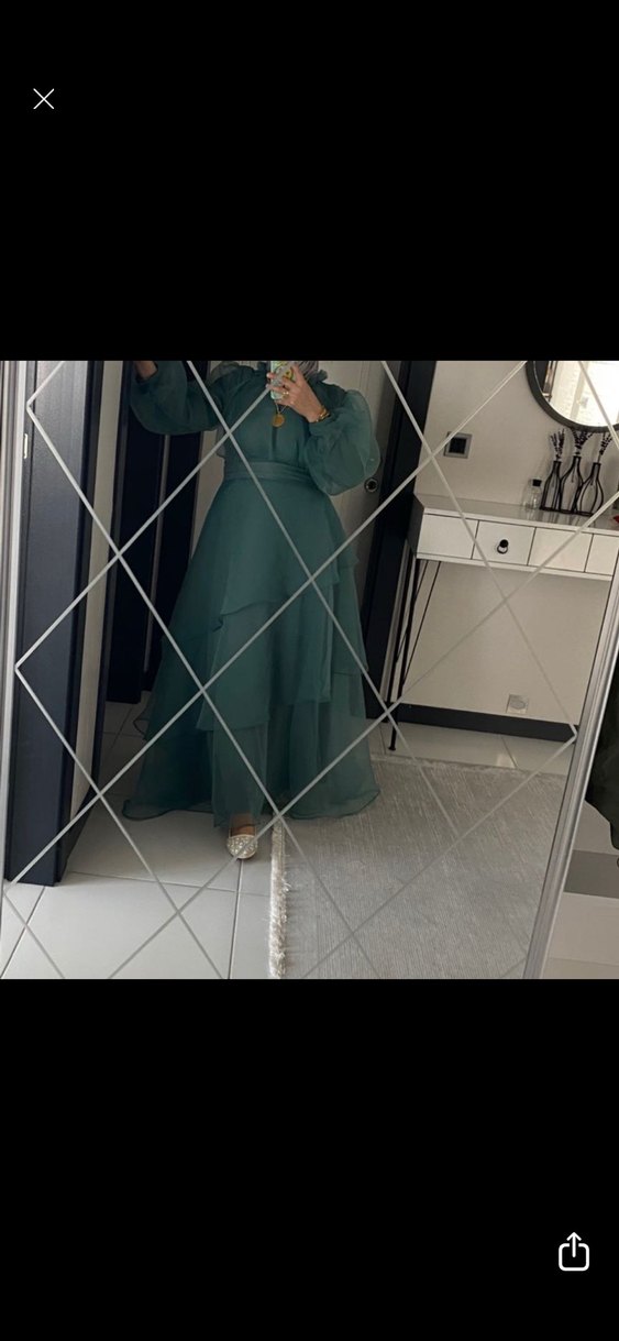 Uzun, bol kesim abiye elbise yüksek yakalı ve transparan katmanlara sahip. Askılı kollu, koyu yeşil tonuyla modern ve sade bir şıklık sunar.