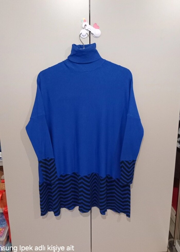Dik yakalı,78cm boy uzunluğu olan ince triko kazak. Beden s olarak görünse de, xl bedene bile uyan bir genişlikte olup,çok az kullanılmıştır.