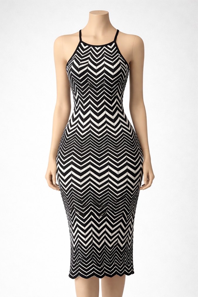 BBS Triko Marka , Siyah beyaz zebra desenli, kolsuz, hafif sim detaylı, sentetik kumaştan yapılmış dar kesim uzun elbisedir.