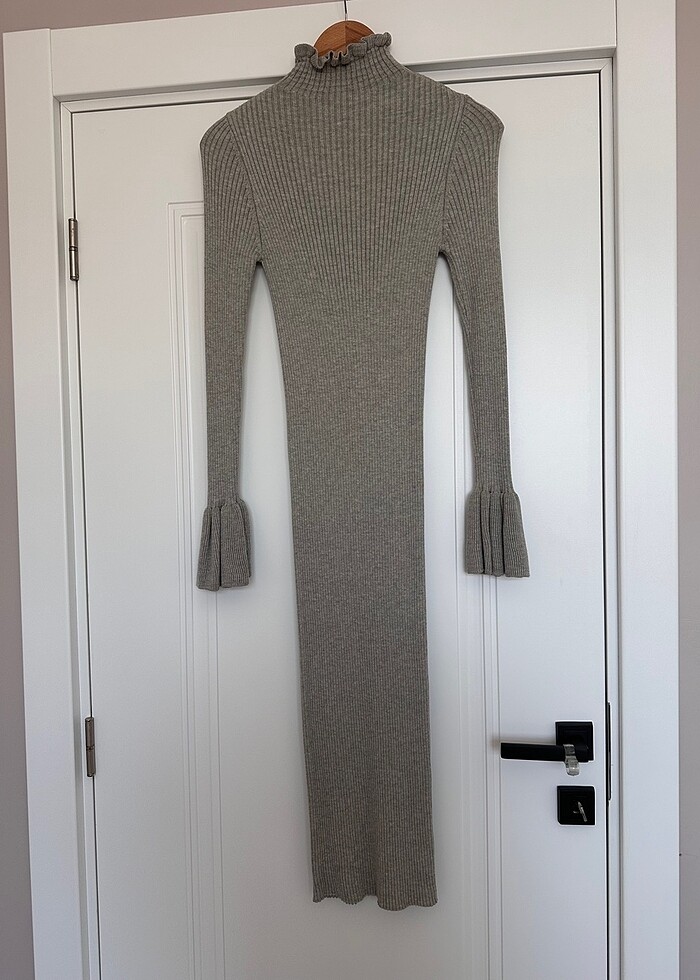 Uzun gri renk triko elbise. Standart beden. S-m-l uyumlu. Vücudu saran bir ürün. Hiç giyilmedi.