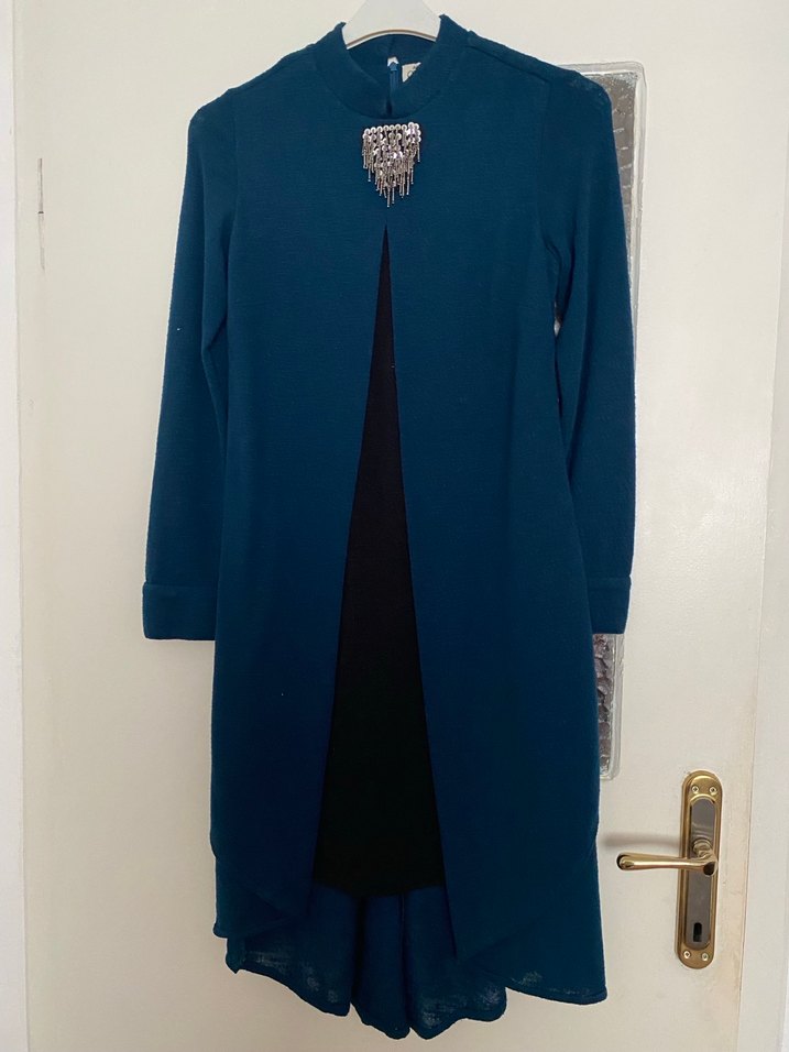 Uzun, koyu lacivert renkteki bu kadın tunik , kesilmiş yaka ve uzun kolludur. Drapeli ön kısmı ve rahat kesimiyle ofis kullanımı için uygundur.