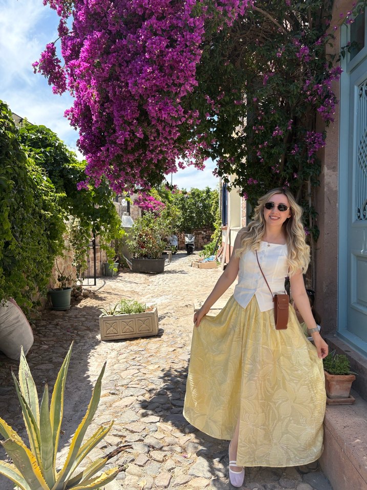 İçinde kısa astarı var. Önden yırtmaç detaylı ve kumaşı kendinden desenlidir. Etek sorunsuzdur.