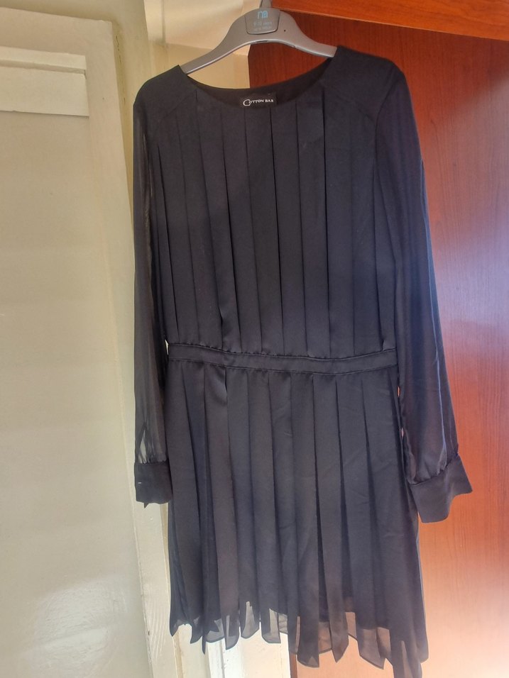 Bu siyah kadın elbise, uzun kollu, piliseli tasarıma ve bol kesime sahiptir. Yuvarlak yakalı ve belde ince detaylıdır, şık bir ofis görünümü için uygundur. Kolları tül detaylıdır. Hiç kullanılmamıştır.