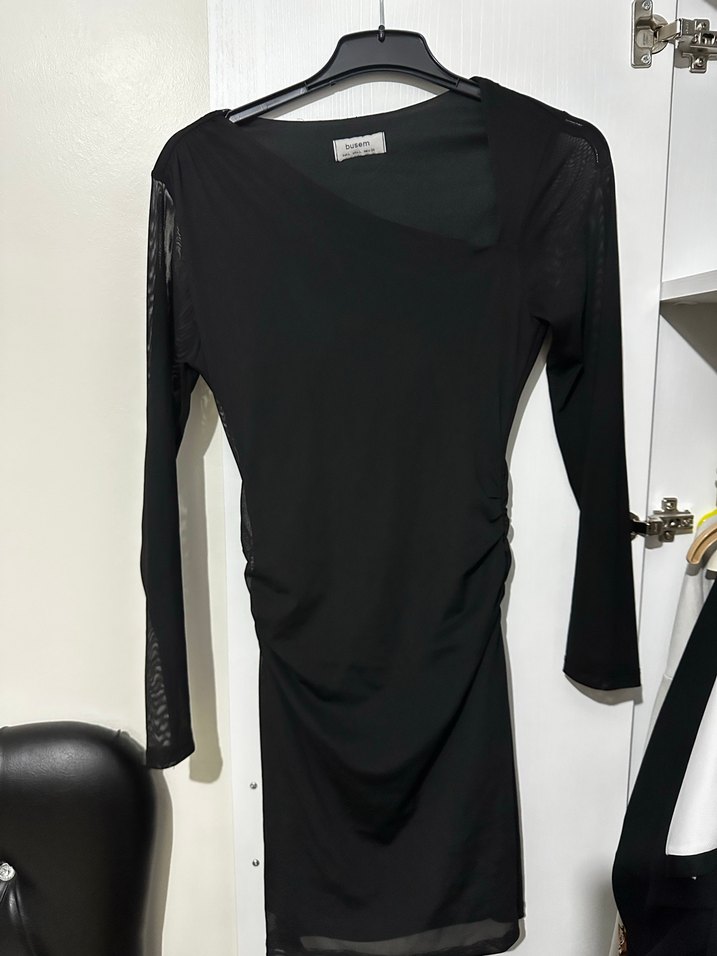 Siyah, uzun tül kollu, asimetrik yaka vücuda oturan mini elbise