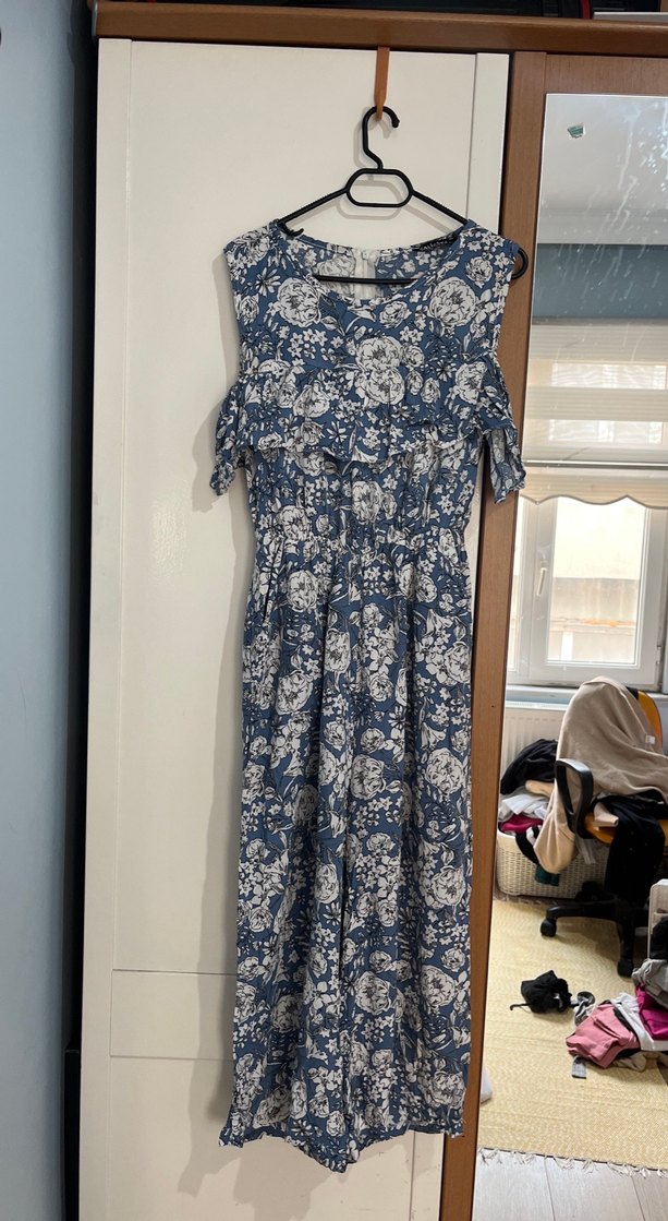 Bohem tarzda, pamuklu, askısız ve salaş kesimli uzun tulumu. Gri-mavi batik desenli, drapeli detaylara sahip. Günlük kullanım için uygun.