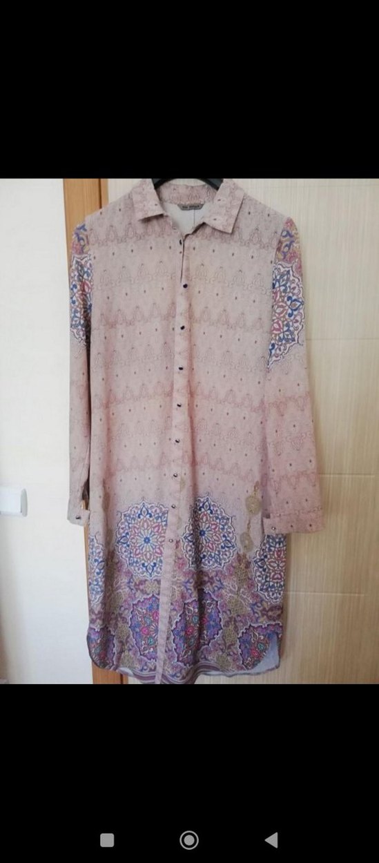 Uzun kollu, yakalı ve düğmeli tunik. Pastel tonlarda batik desenli