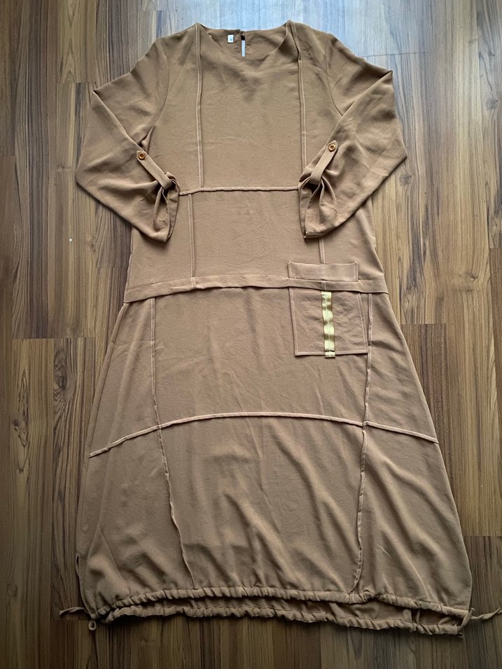 Hem tunik hem de elbise niyetine kullanılabilecek, uzun kol, yuvarlak yaka, üzerinde detayları bulunan spor tarzda elbise.