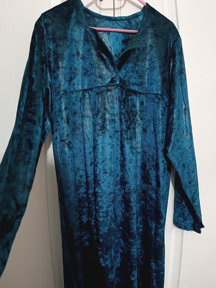 Uzun kollu, bol kesim, koyu turkuaz bağlama desenli, bohem tarzda kadın robalı elbise özel dikimdir