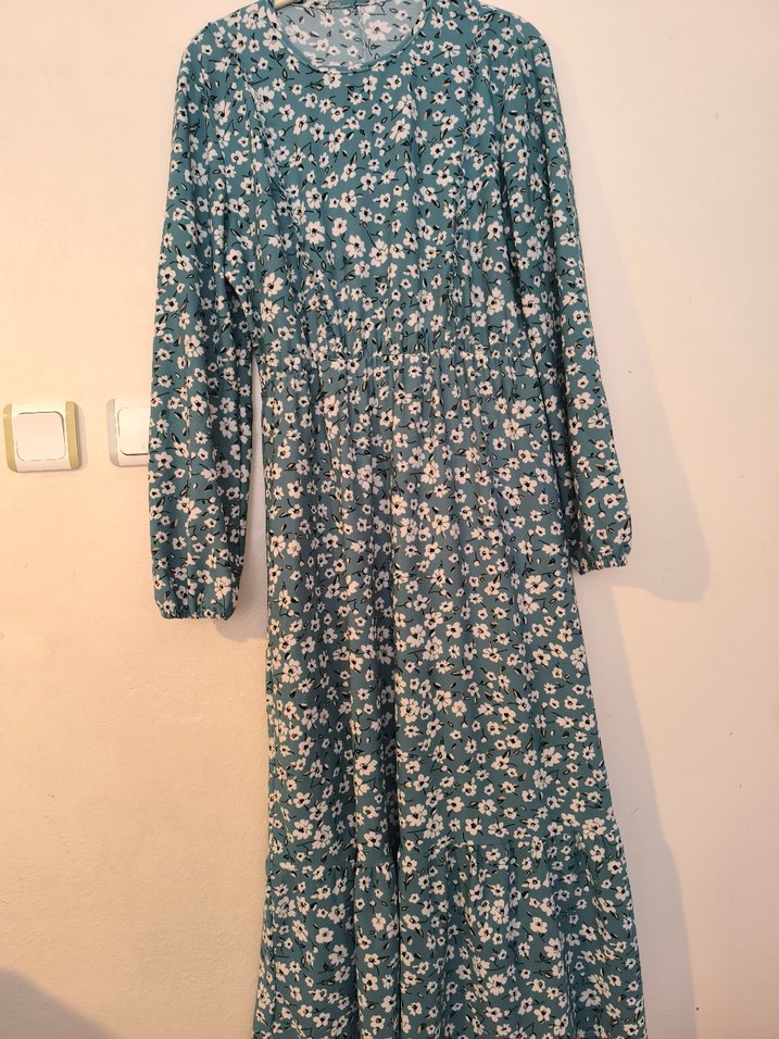 Uzun, turkuaz renkli, bol kesim, uzun kollu, küçük bir yerinde yırtık var belli olmuyor dikilir