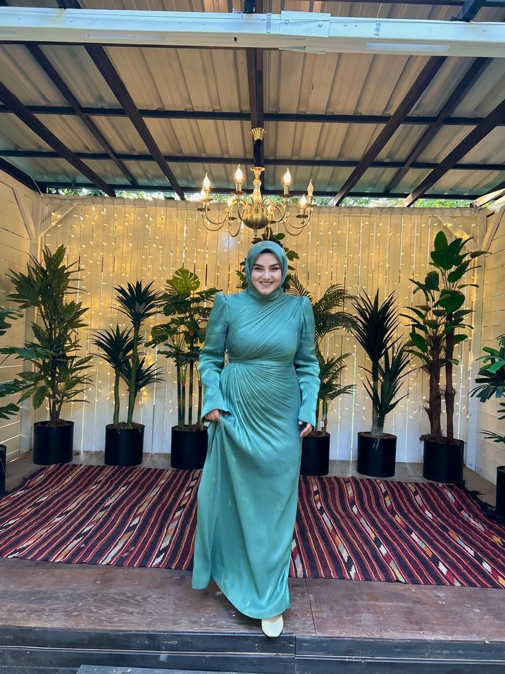 Uzun Turkuaz Bohem Drapeli Tesettür Elbise