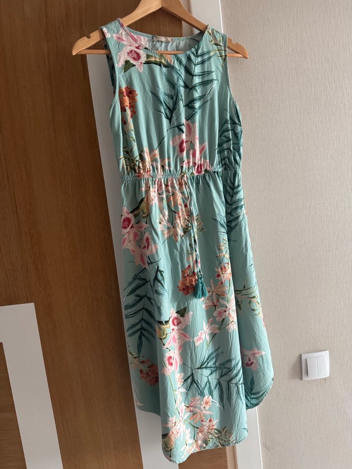Uzun turkuaz elbise, gevşek kesim ve kolsuz tasarıma sahiptir. Çiçek desenli, drapeli ve straplez yakalıdır, yumuşak sentetik kumaştan üretilmiştir.