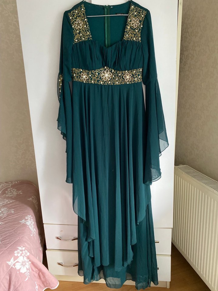 Uzun turkuaz bohem tarzda, uzun kollu, V yakalı, bol kesim ve drapeli kadın abiye elbise. Parlak desen detaylarıyla düğün için uygundur. Teklif verebilirsiniz