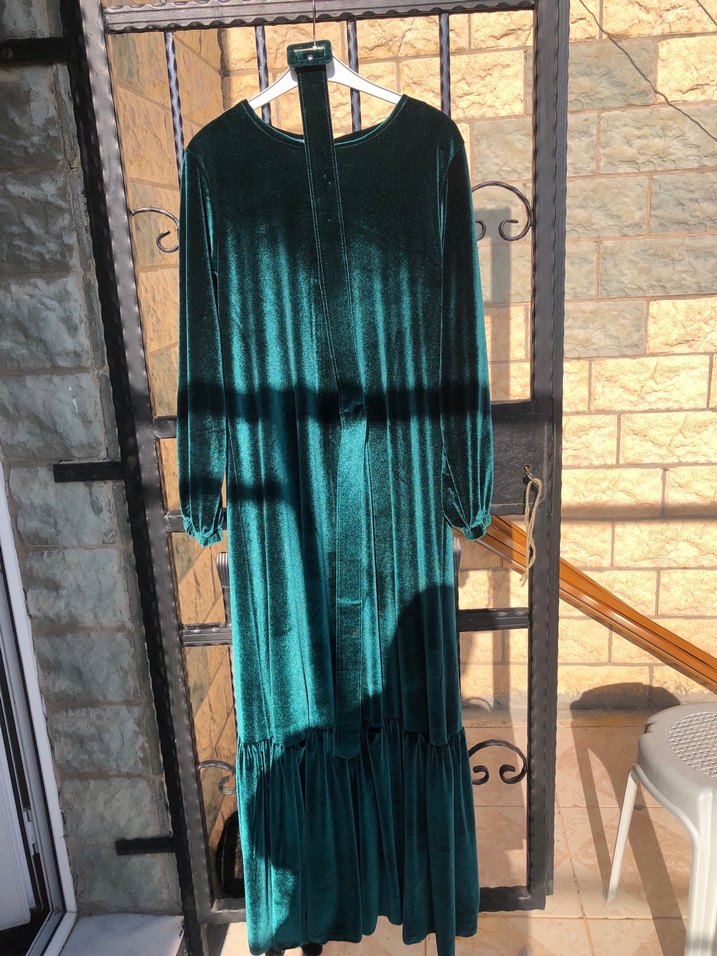 Yumuşak sentetik kumaştan, uzun kollu ve yuvarlak yakalı, bol kesim turkuaz uzun elbise. Bohem tarzı için drapeli tasarıma sahiptir. Kadife