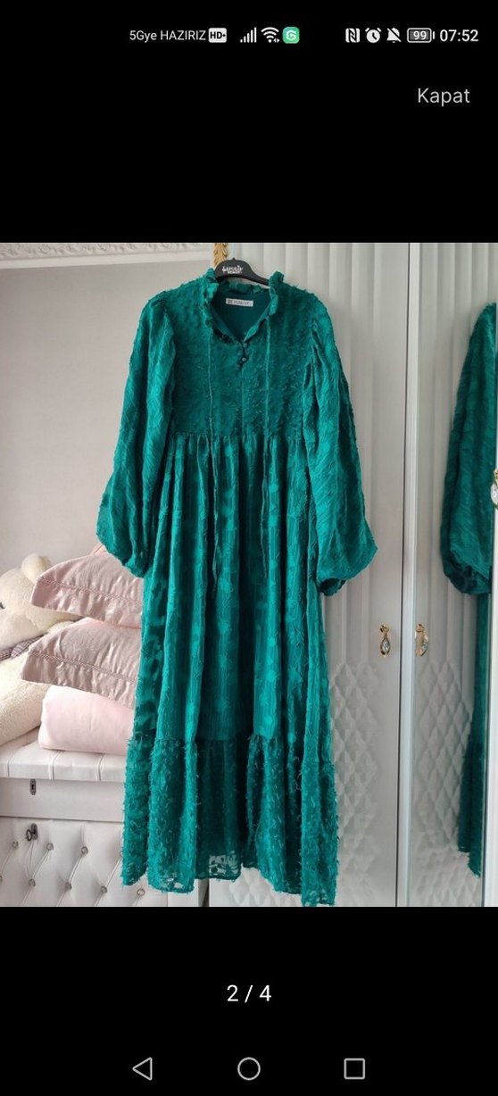 Uzun, turkuaz keten elbise, nakışlı desenler, fırfır detaylı, uzun kollu ve yüksek yakalı, bol kesim bohem tarzda.