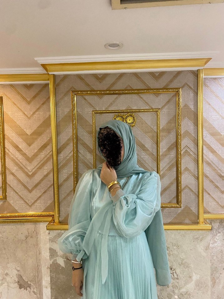 Uzun boy, yüksek yakalı, uzun kollu ve bol kesim turkuaz elbise, bohem tarzıyla ve drapeli detayıyla düğünler için uygun.