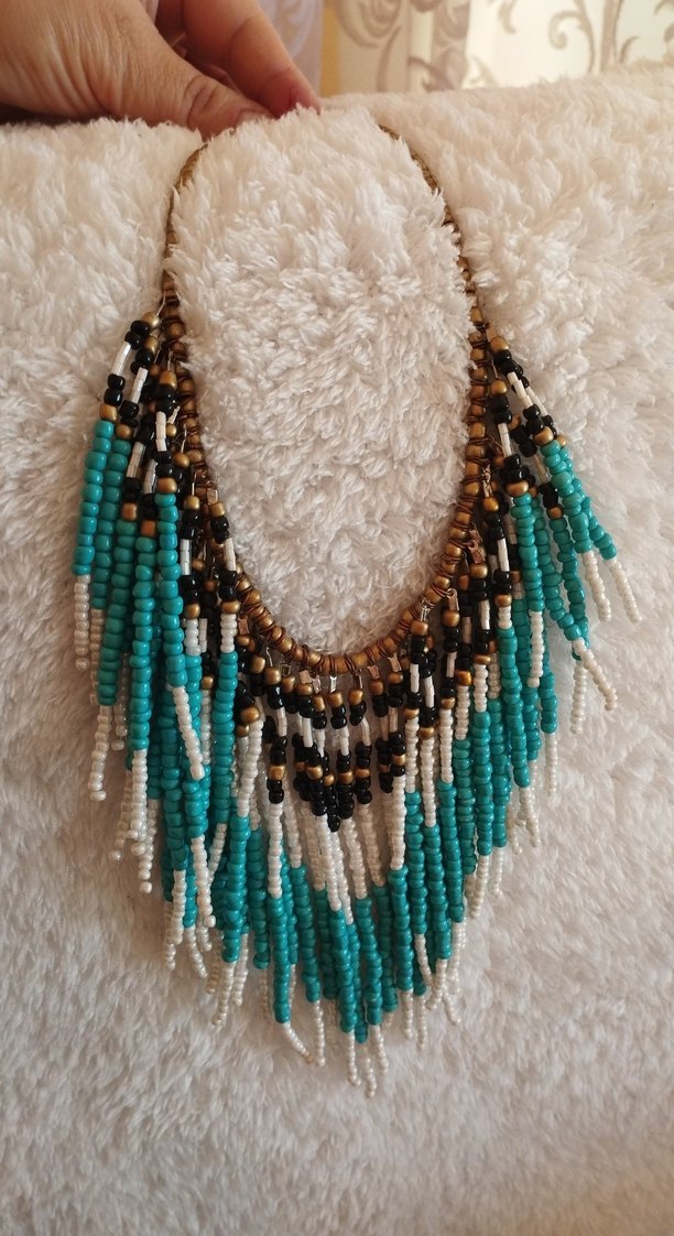 Uzun, renkli turkuaz, siyah ve beyaz boncuklardan oluşan bohem tarzda günlük kullanıma uygun kolye.