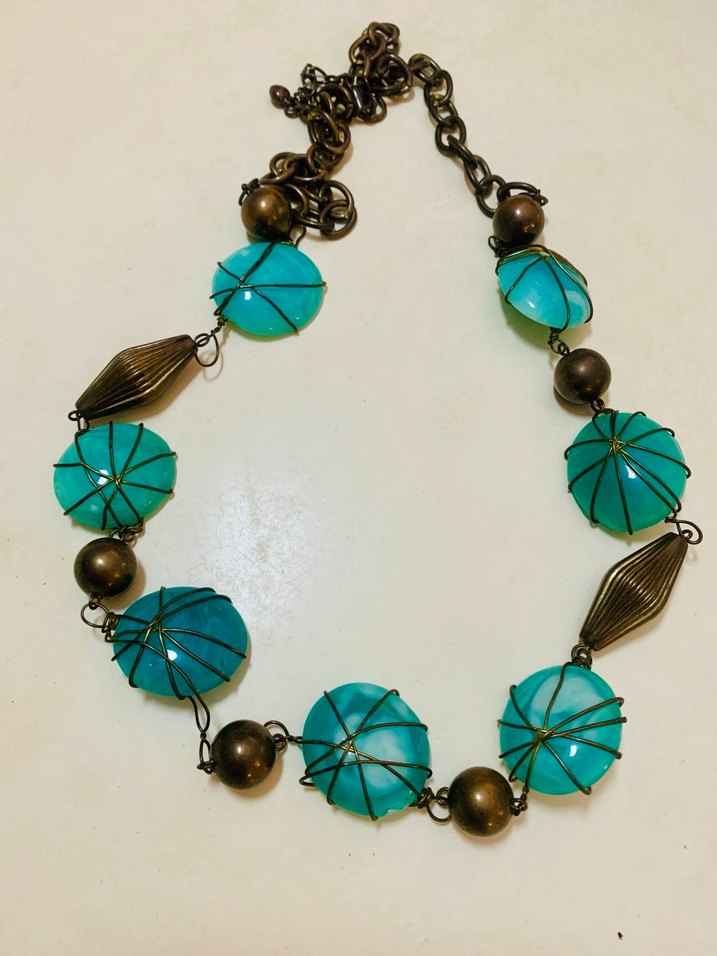Bronz detaylı uzun turkuaz boncuklu kolye, günlük kullanıma uygun bohem tarzda.
