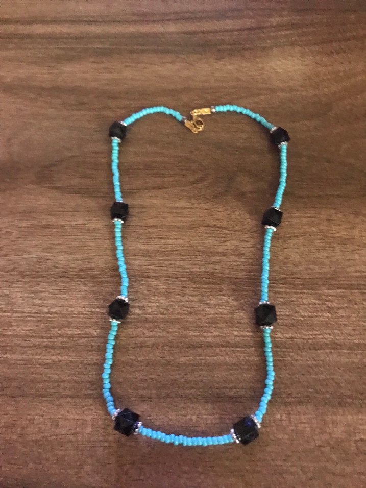 Uzun boyda, turkuaz boncuklar ve siyah detaylarla bohem tarzında günlük kullanıma uygun kolye.
